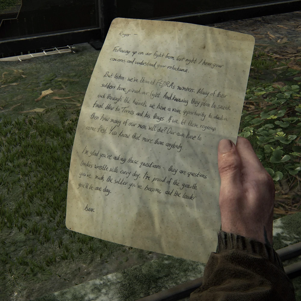 La Carta de Isaac es un artefacto coleccionable en The Last of Us: Parte II que se puede obtener durante el capítulo: Seattle, Dia 1.[1]