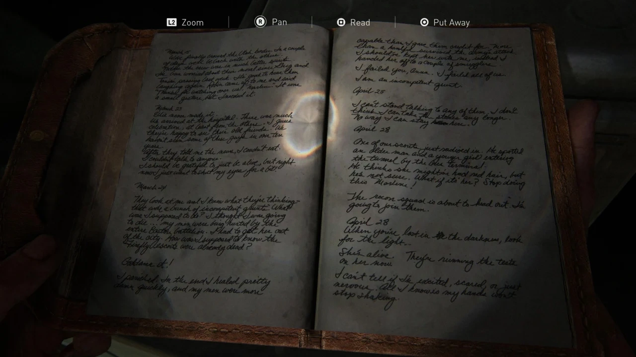 El Diario de Marlene es un artefacto coleccionable de The Last of Us: Parte I que se puede obtener durante el capítulo: El laboratorio de los Luciérnagas.
