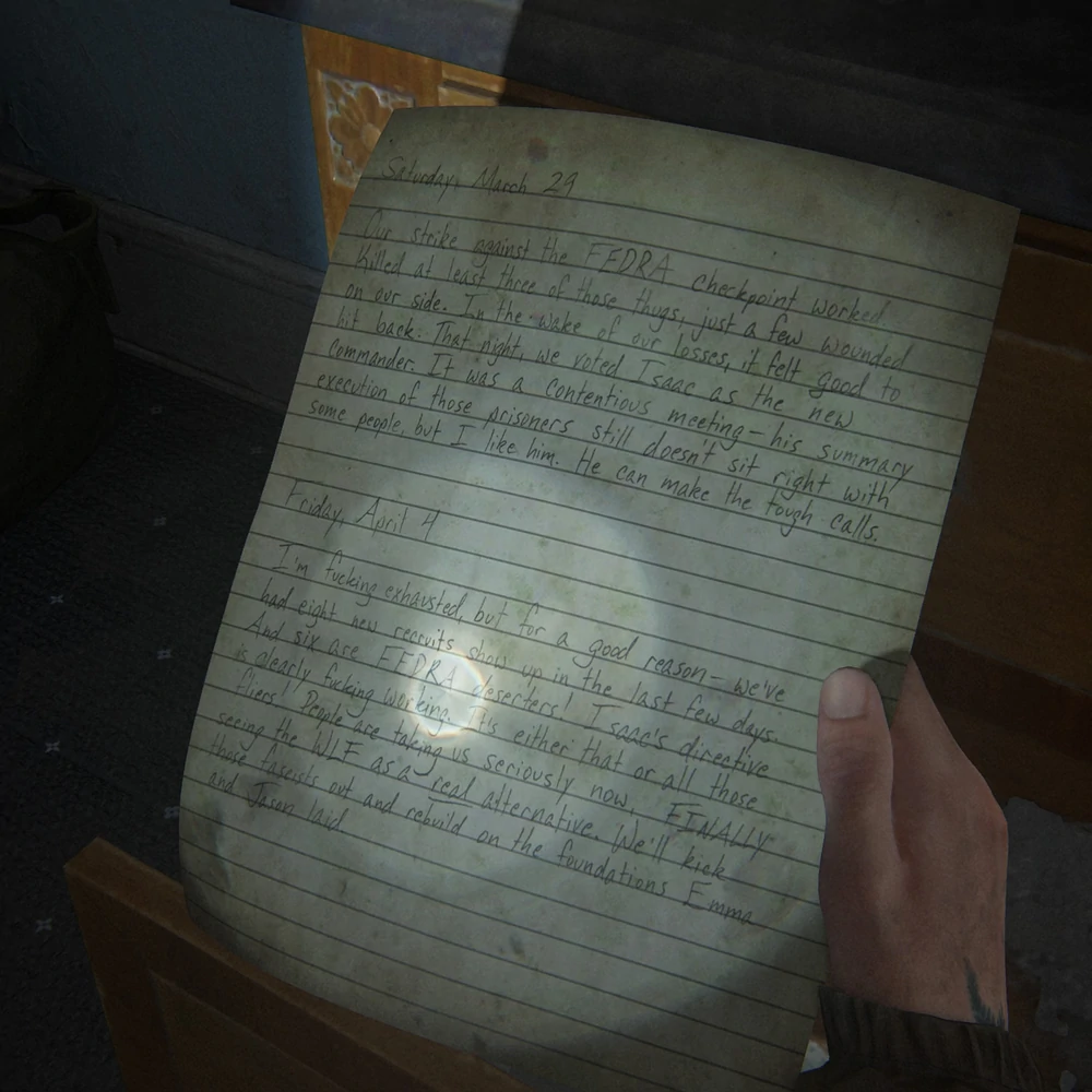 - ↑ The Last of Us: Parte II. Episodio 2 Seattle, Día 1.