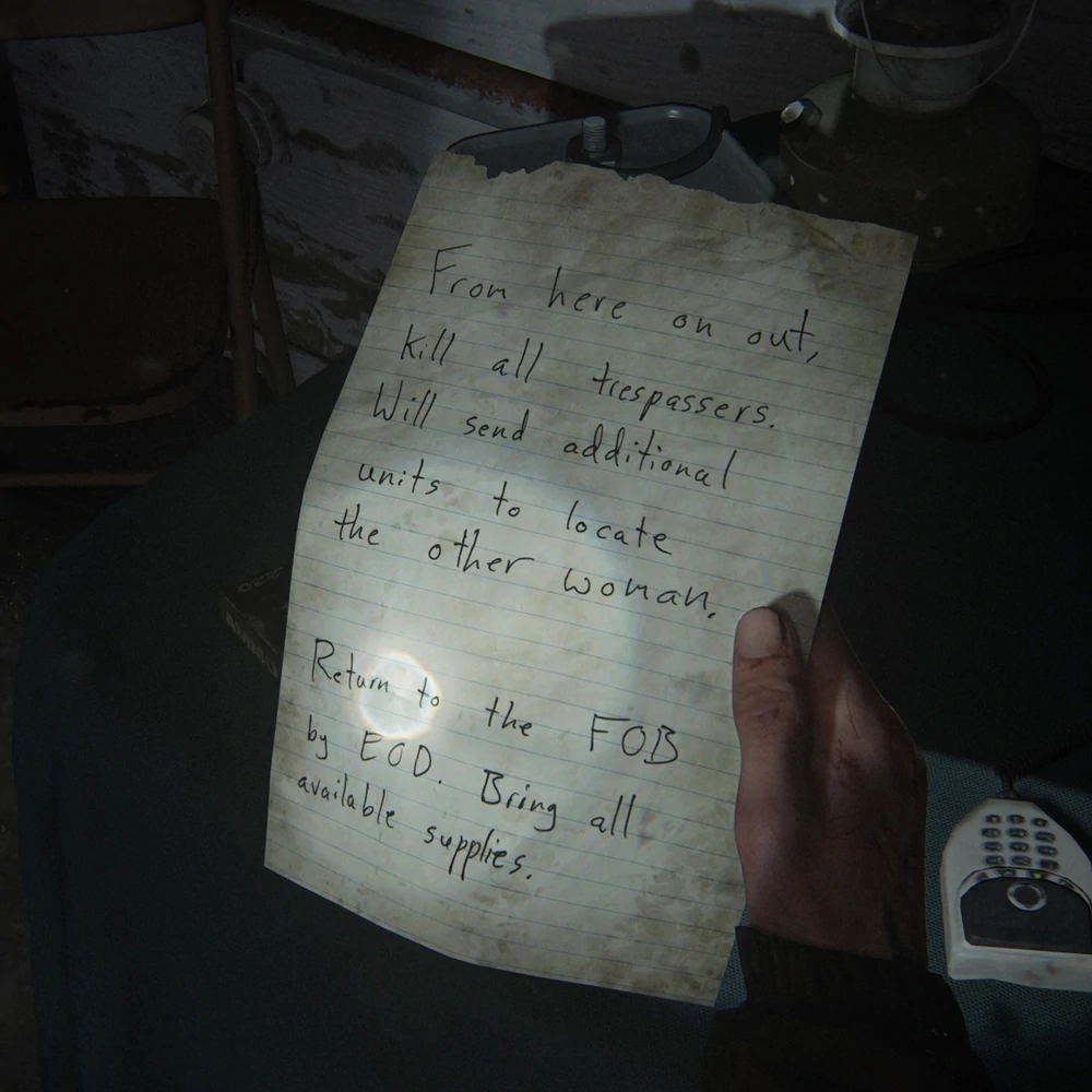 La nota se puede encontrar en el piso superior de la Escuela Primaria Eastbrook. Después de despejar a los soldados de WLF en el techo de la escuela, continúa hacia el edificio. Dentro, encuentra una mesa cubierta con una lona azul. La nota estará sobre la mesa, al lado de la radio.