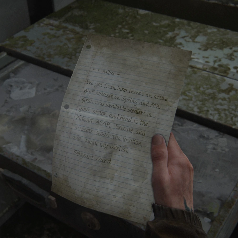 Este artefacto se puede encontrar en una torre de vigilancia frente a la sinagoga. Ingrese por la puerta al lado del letrero "Distribución de combustible" y gire a la derecha. Sube la escalera para llegar a la torre de vigilancia y busca en el cajón para encontrar la nota.