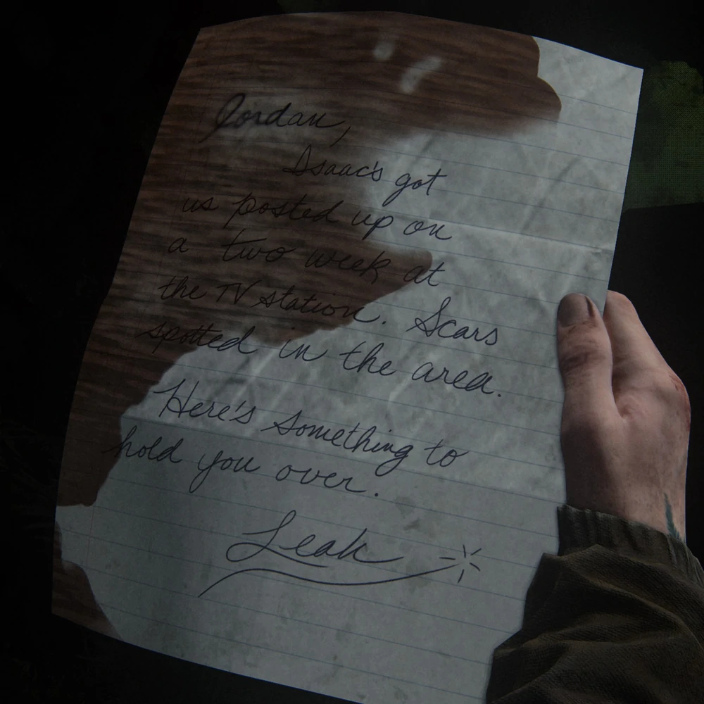 La Nota de Leah es un artefacto coleccionable en The Last of Us: Parte II que se puede obtener durante el capítulo: Seattle, Dia 1.[1]