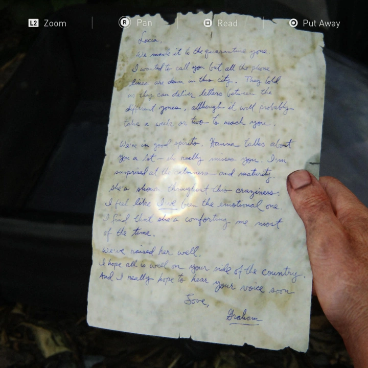 - Después de ir a la tienda en la esquina de la zona de triaje (Donde se encuentra el "Mapa de la ZC de Salt Lake"), Ellie te dirá que tiene algo para ti, ella te dirá que le robó a María una foto para Joel, donde aparece Joel y Sarah cuando ésta gana el trofeo.