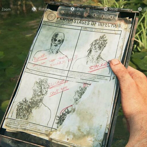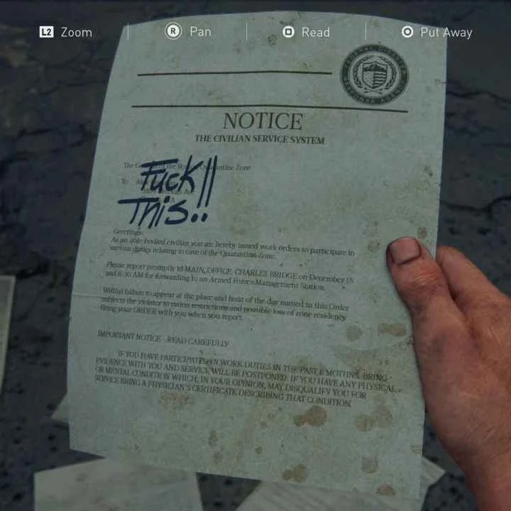 Mientras caminan hacia el punto de control que deben pasar para llegar a su destino, Tess comenta que la línea de raciones aún no se ha abierto, pero que la gente ya está haciendo fila debido a la escasez. El dúo también está presente cuando cuatro civiles son sacados a rastras de un edificio en ruinas cercano por soldados con trajes HAZMAT, quienes los escanean para ver si están infectados. Los dos primeros se encuentran limpios, pero el tercero da positivo. A pesar de alegar que no lo es, un soldado la inyecta letalmente y la mata. El cuarto civil intenta escapar, solo para ser asesinado a tiros.