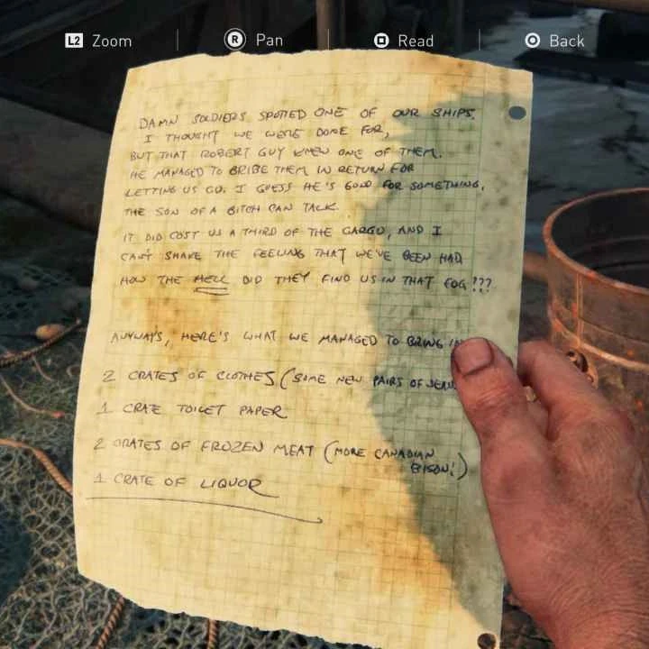 Lista del cargamento | Barrios bajos | Antes de entrar en la caseta donde te espera Robert, busca en la zona del muelle, próximo del barco hundido. |