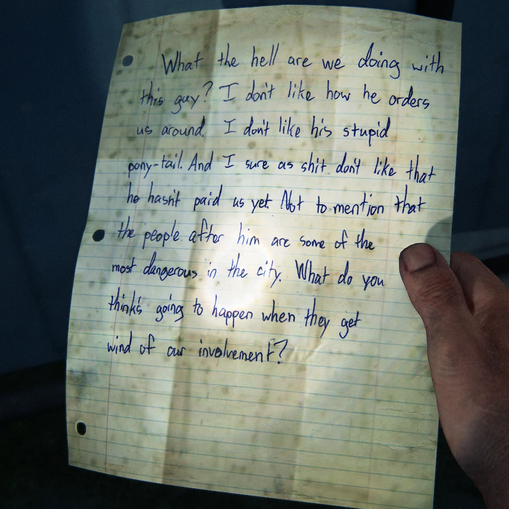 Nota para hermano | Al otro lado del muro | Al eliminar al primer infectado con ayuda de la escucha atentamente, sube las escaleras y entra en la habitación de la izquierda, ante de cruzar los tablones. Estará sobre una mesa. |