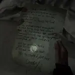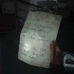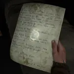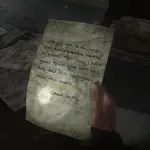 Nota de suicidio | El Regalo de Cumpleaños | Arrástrate a través de la brecha en la pared, después de la habitación con toda la escritura en la pared, encontrarás un cadáver. Sobre el cuerpo está escrito, "No hay luz". El Artefacto está al lado de su cuerpo. |
