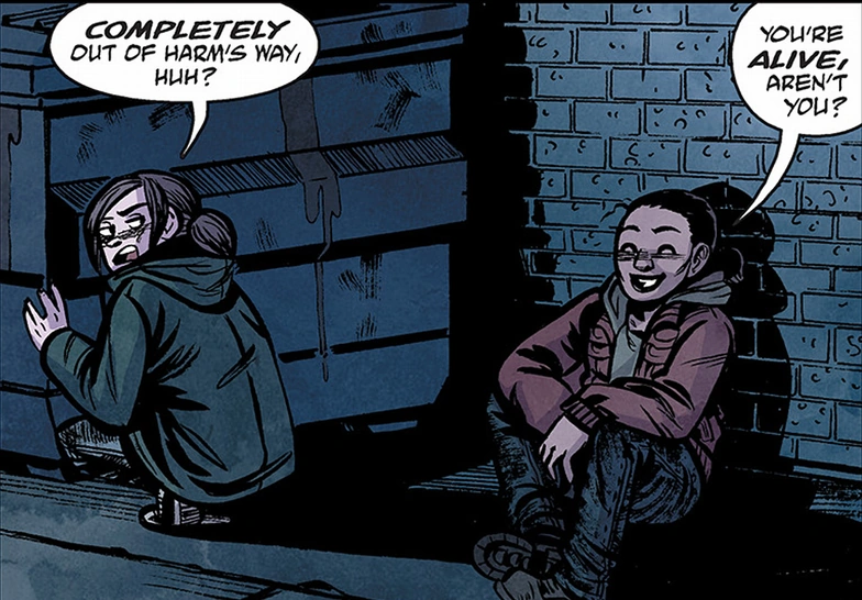 Son cri a alerté les militaires de leur présence, les forçant à courir quand ils leur ont tiré dessus. Descendant des toits, Riley et Ellie se réfugient dans une allée derrière une benne à ordures. Quand Ellie se moqua de l'assurance de Riley pour leur sécurité, Riley ne tarda pas à lui rappeler qu'elle était toujours en vie. En se reposant, Ellie lui a demandé où elle avait trouvé les grenades. Riley a révélé qu'elle les a volées à Winston et son vol a suggéré que leur "amitié incroyable" était terminée. Ellie remarqua quelqu'un qui se tenait à la porte d'un immeuble avec une bande jaune de "quarantaine" suspendue à ses murs.