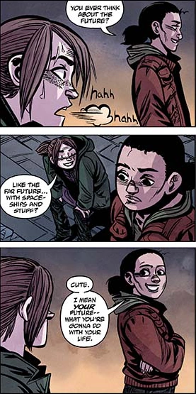 En dehors de l'école, Riley mena Ellie à travers les toits de la ville, sans être détectée par les soldats qui patrouillaient dans les rues en contrebas. Elle s'arrêta sur le rebord d'un immeuble juste en dessous d'elle et demanda à Ellie si elle pensait un jour à l'avenir. Ellie prit la question à la légère, la trouvant rhétorique. Riley élabora sa question plus sérieusement et demanda à Ellie ce qu'elle voulait faire de sa vie.