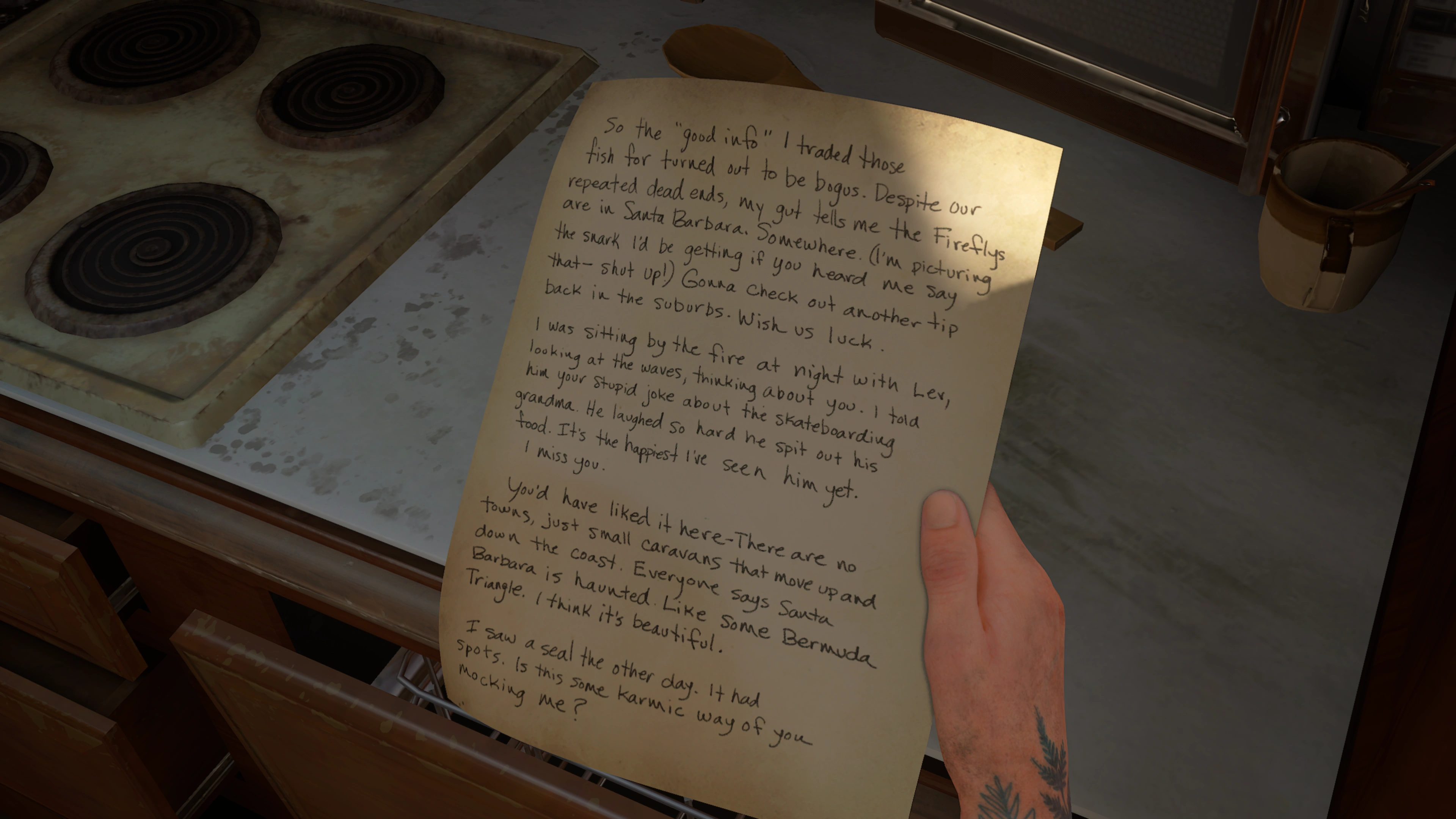 Abby's note is a handwritten note from Abby Anderson. She reminisces over Owen Moore and details her search for the Fireflies in Santa Barbara.
