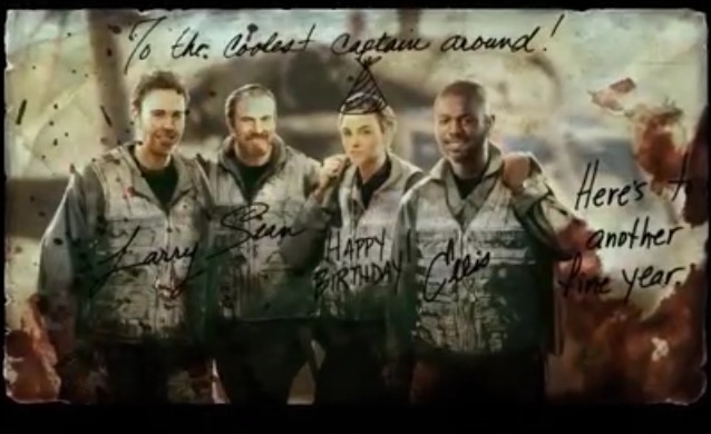 The photo is of four members of a military unit. They are celebrating Captain Regan's birthday. One soldier has playfully drawn a party hat and balloon over the Captain.