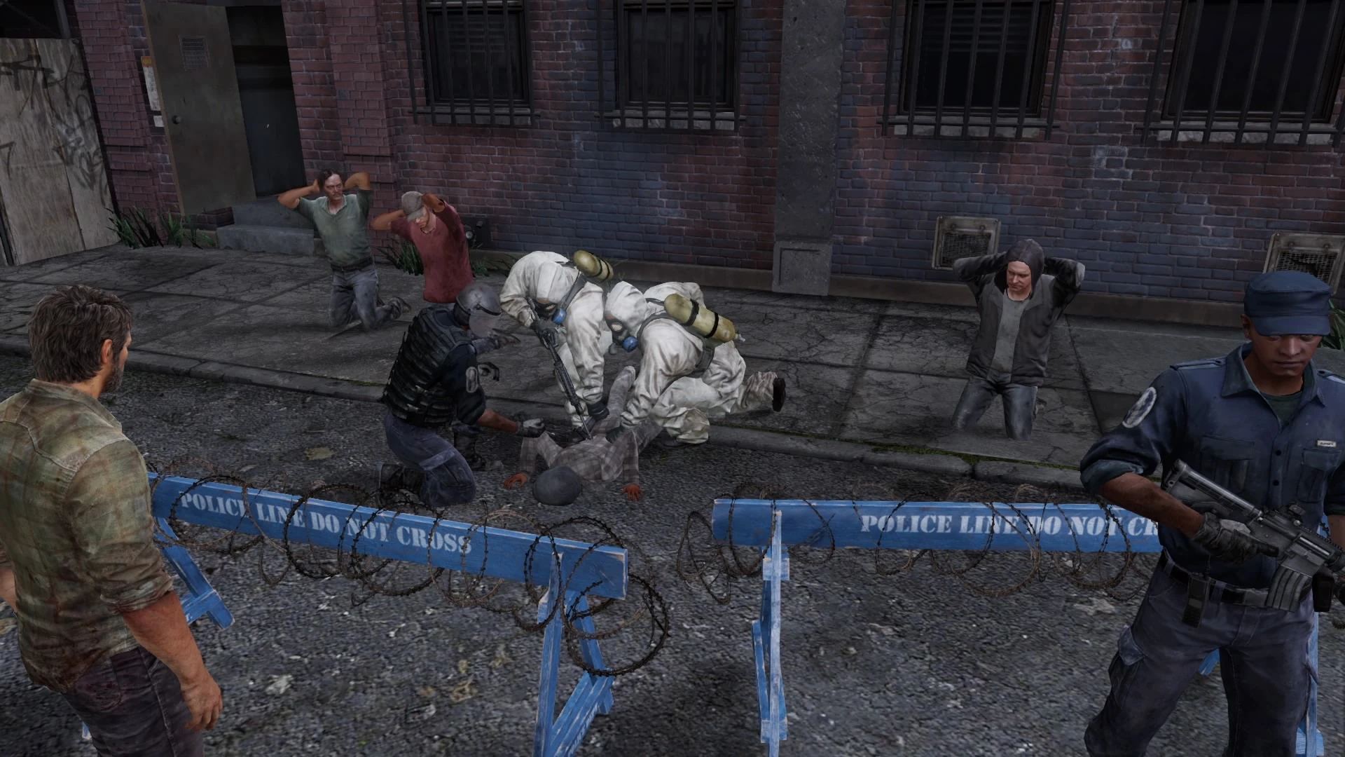 Following the outbreak of Cordyceps brain infection (CBI) in September 2013, the Federal Disaster Response Agency, deployed across the country, working alongside with regular military forces and law enforcement, attempted to contain it. When Joel, Tommy, and Sarah attempted to escape the infection, they witnessed the military setting up roadblocks along the highways, which caused a large traffic jam. They also saw military helicopters flying over their heads. It is known that in Austin, Texas and other major cities, they were resorting to extreme measures to prevent the spread of the infection, such as summarily executing American citizens. An example of this was seen when a FEDRA soldier shot and killed Sarah.[12]