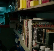 They head down to the sub-basement, where they find Bill's wall of guns and the radio broadcast, which is still blasting 80s music: the system was automatically set to start playing the "trouble" playlist if it was not reset every few weeks. Ellie once again asks Joel if she can take one of Bill's guns, and again he refuses. They rummage through the house for supplies, with Ellie getting a hot shower and a change of clothes. While waiting for Joel to finish his shower, Ellie finds Frank's gun in a drawer. When she hears Joel approaching, she quickly hides it in her backpack.