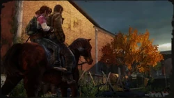 Ellie is forced to protect the both of them, as Joel is incapacitated by pain, and extreme blood loss. They manage to exit the building and, after Ellie shoots a looter who attempts to steal Callus, ride away from the university. Joel taking the reins, they get far enough for Ellie to assume they are safe. Suddenly, Joel slumps and falls off the horse, passing out. Ellie tries to wake him up, calling his name and asking him what she should do.